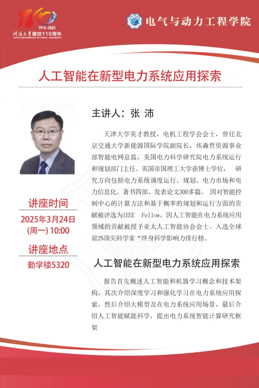 学术讲座:人工智能在新型电力系统应用探索