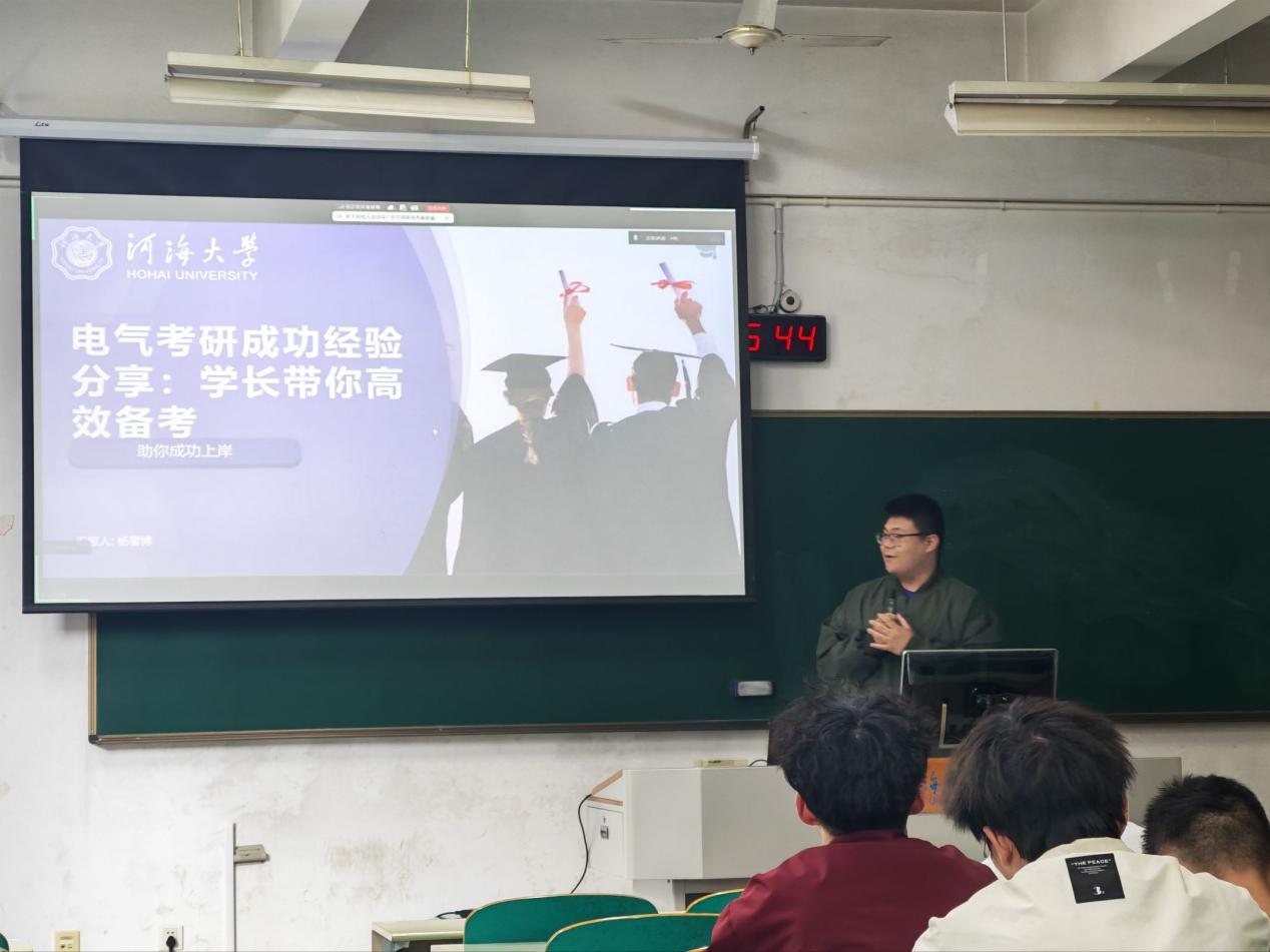刘震岳同学则聚焦考研专业课与报考程序,带来极具实操性的建议。他提醒同学们“先确定院校,为目标努力”,避免盲目报考,同时关注官网动态以防专业课改考。在专业课备考上,他主张分阶段推进:前期梳理框架、暑期强化做题、秋季真题训练、考前全真模拟。他还详细介绍了报考程序中的关键节点,如预报名、正式报名、线上确认、准考证打印等,并鼓励有意报考河海大学的同学提前联系导师,做到“少鸽子、讲诚信”。